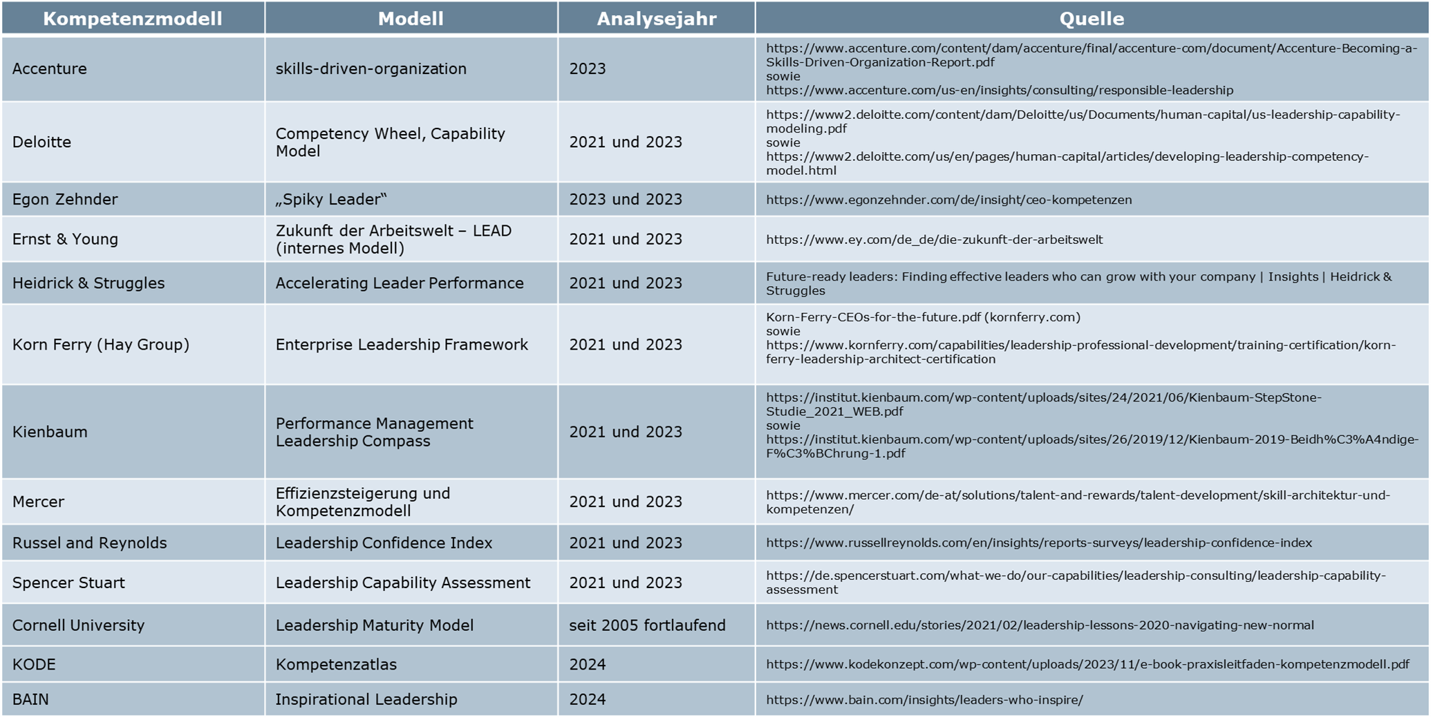 Nun sind am Markt viele unterschiedliche Kompetenzmodelle im „Einsatz“. Dabei stellt sich die Frage, welches entsprechend der obigen vier Kriterien am geeignetsten erscheint. Dabei evaluierten wir in den Jahren 2021, 2023 und 2024 folgende gängigen Modelle: