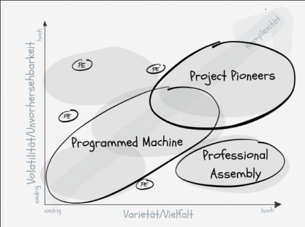Diese Typen lassen sich gut in die Komplexitätslandkarte einordnen – von der „Maschine“ unten links bis zu den „Pioneers“ oben rechts.